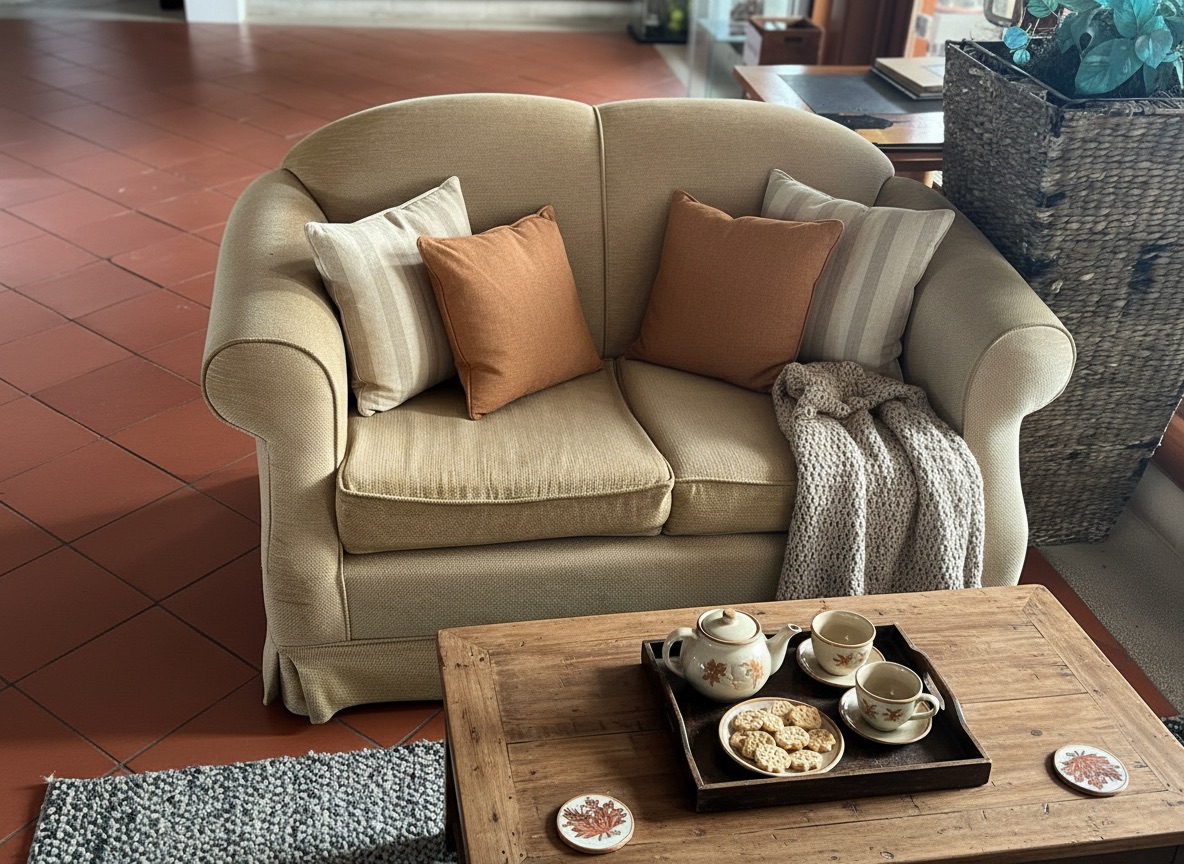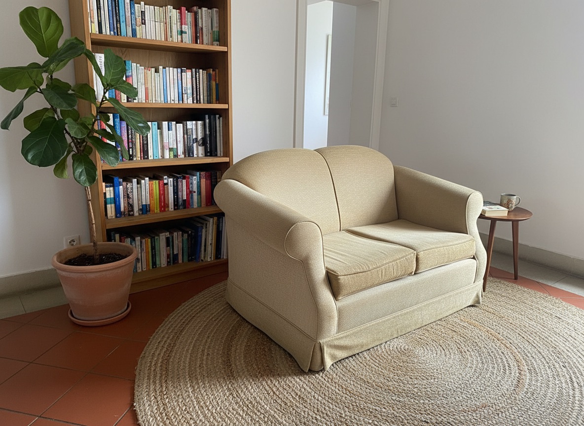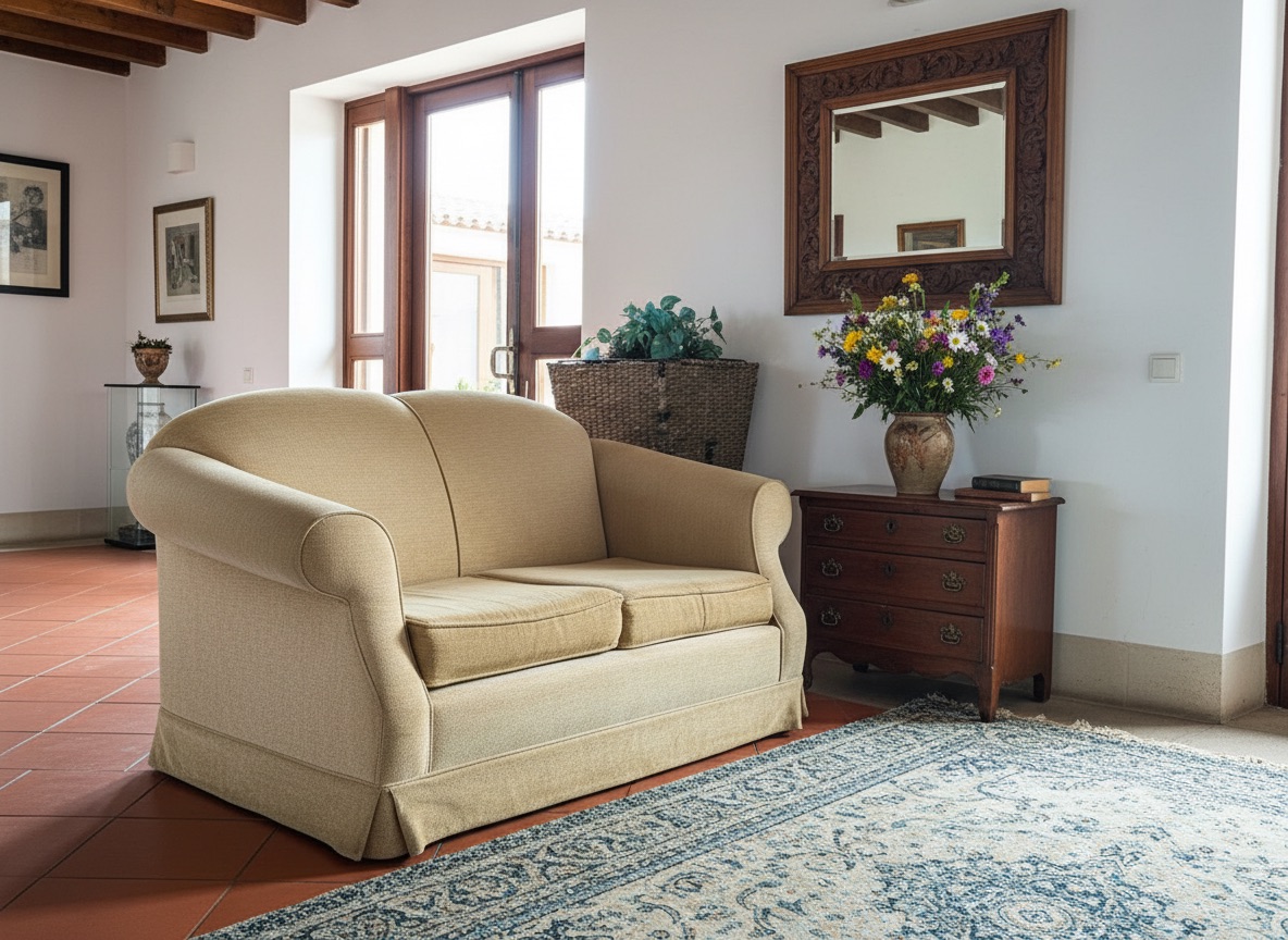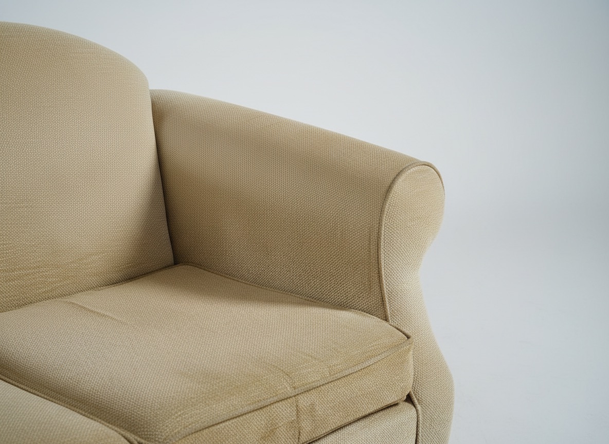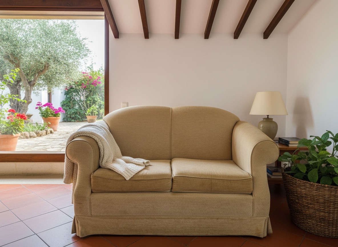 Sofá de dois lugares em tecido bege, com toque macio e estrutura sólida.