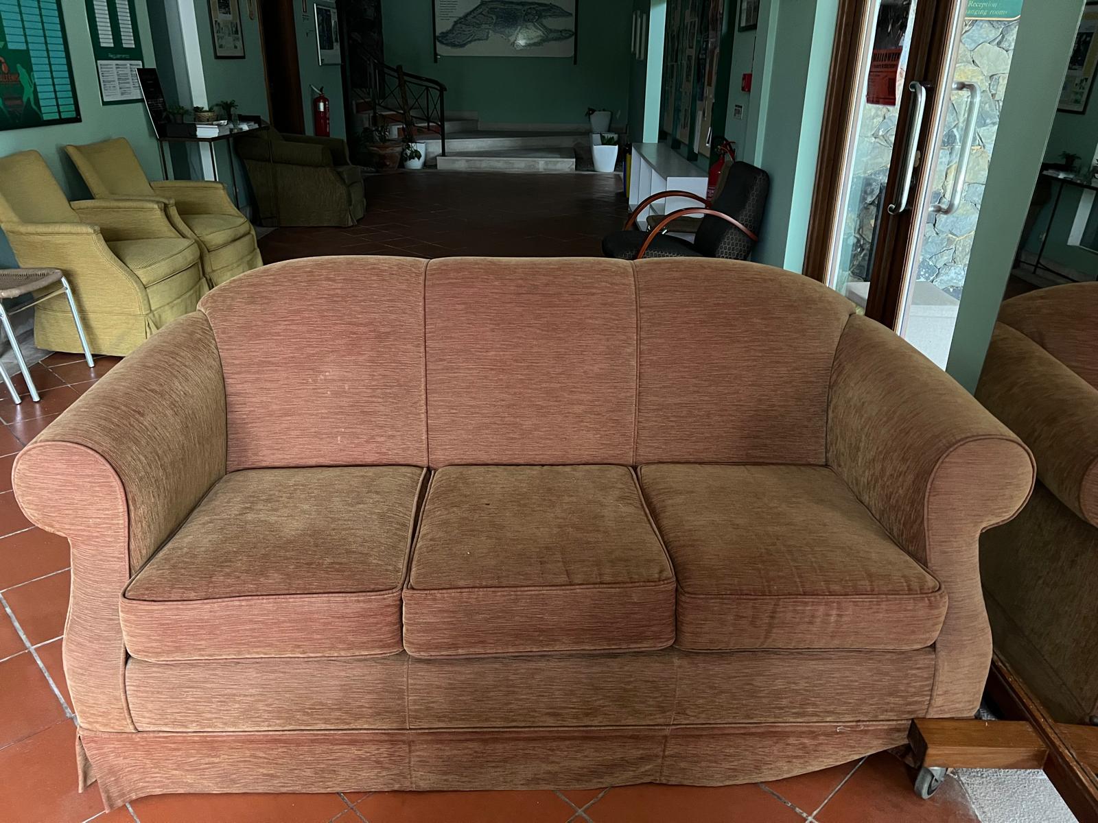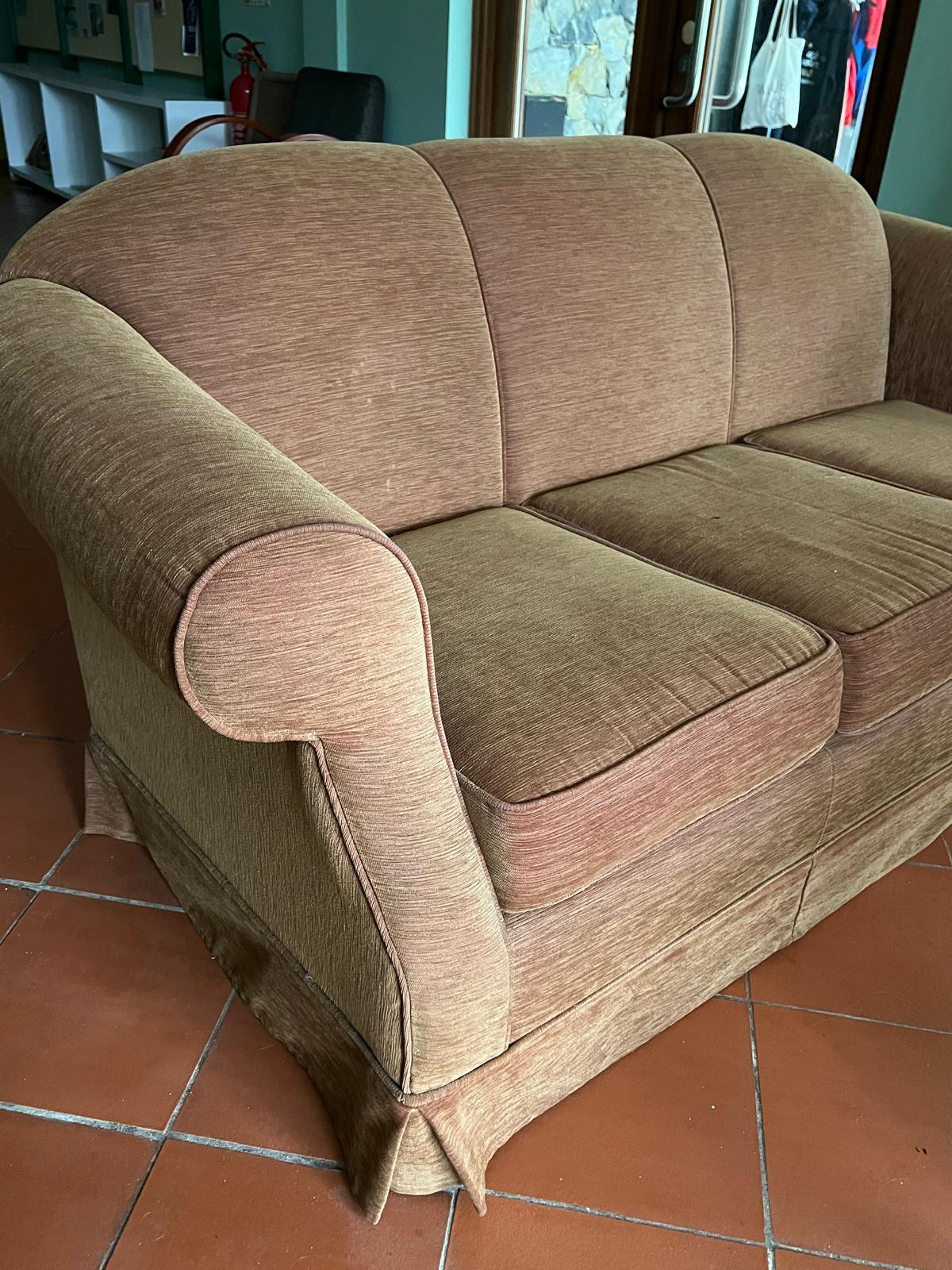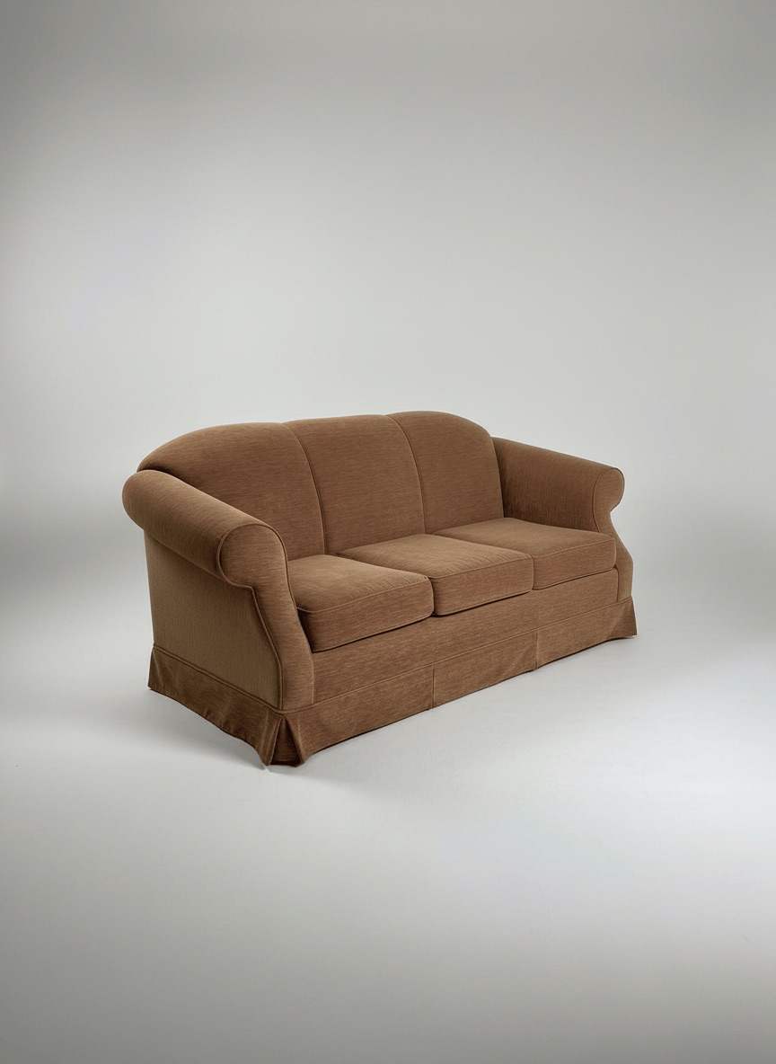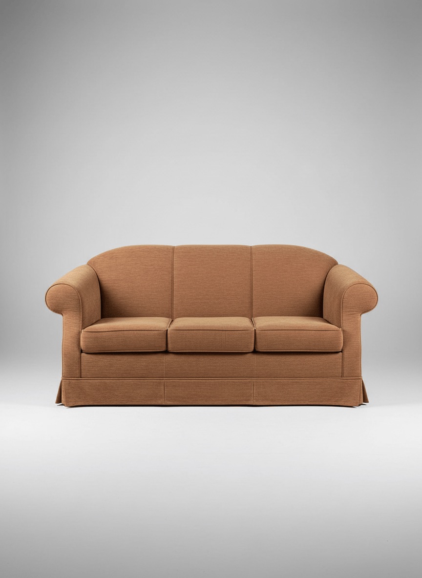 Sofá espaçoso e robusto de estilo tradicional, ideal para salas de estar familiares. Apresenta braços enrolados volumosos e acabamento com "saia" na base.