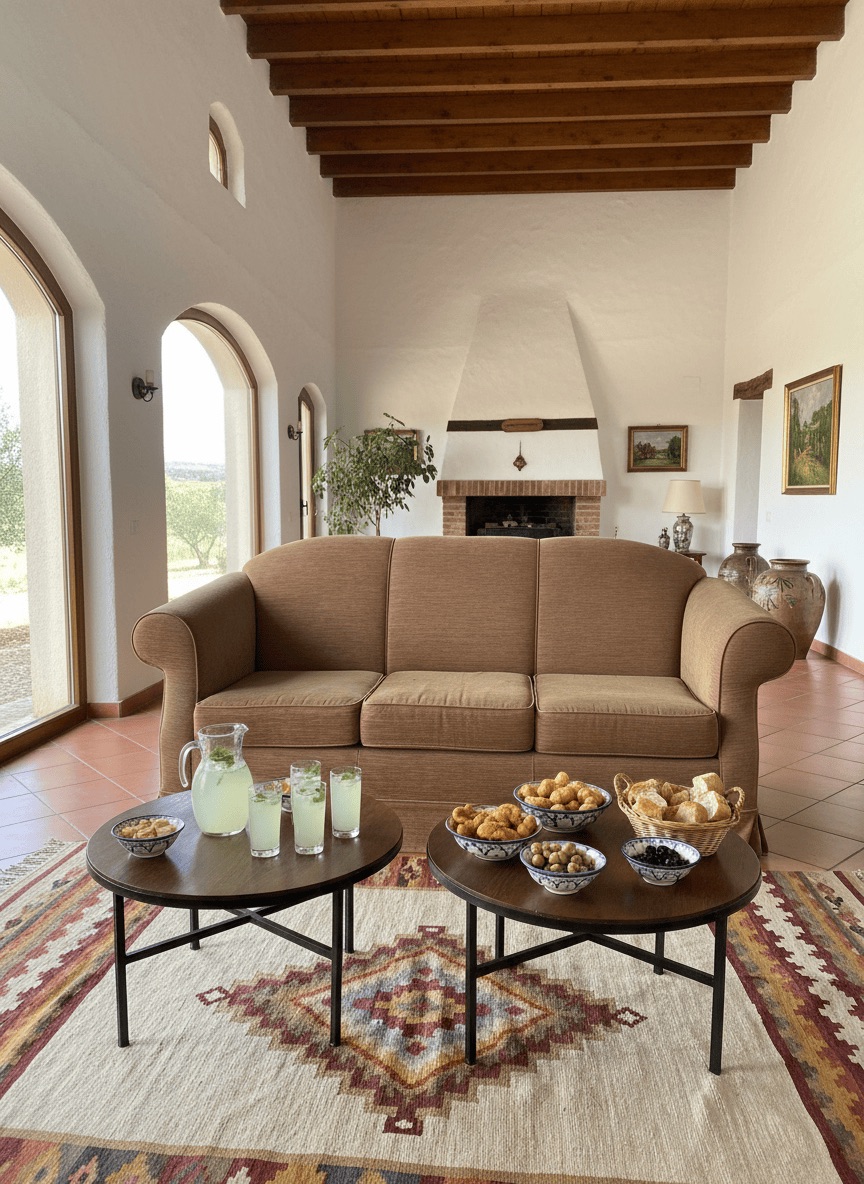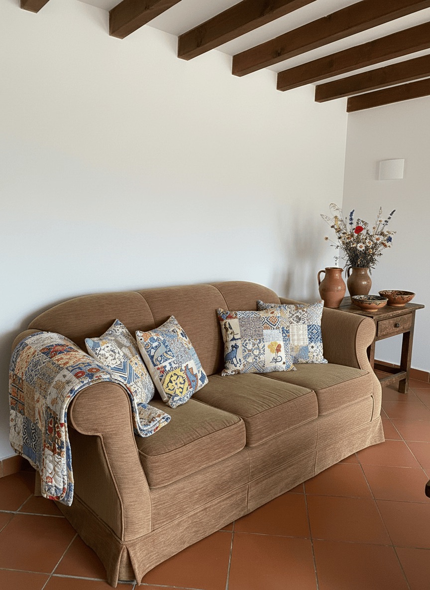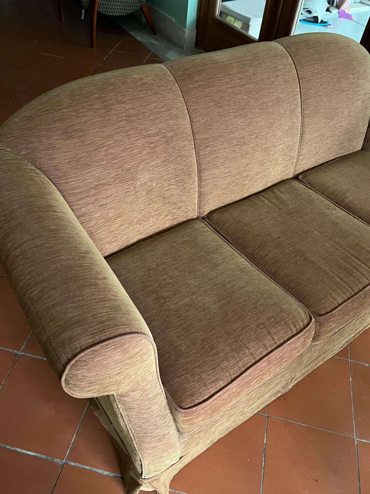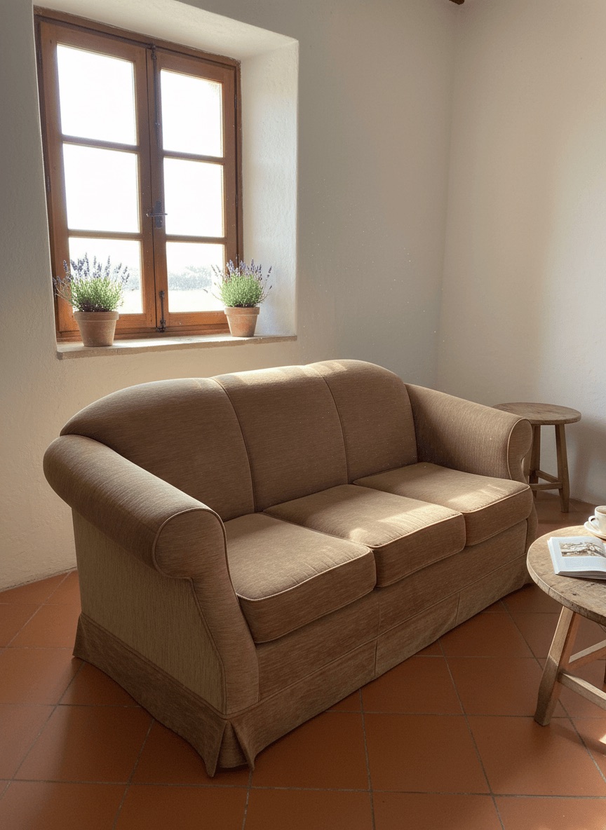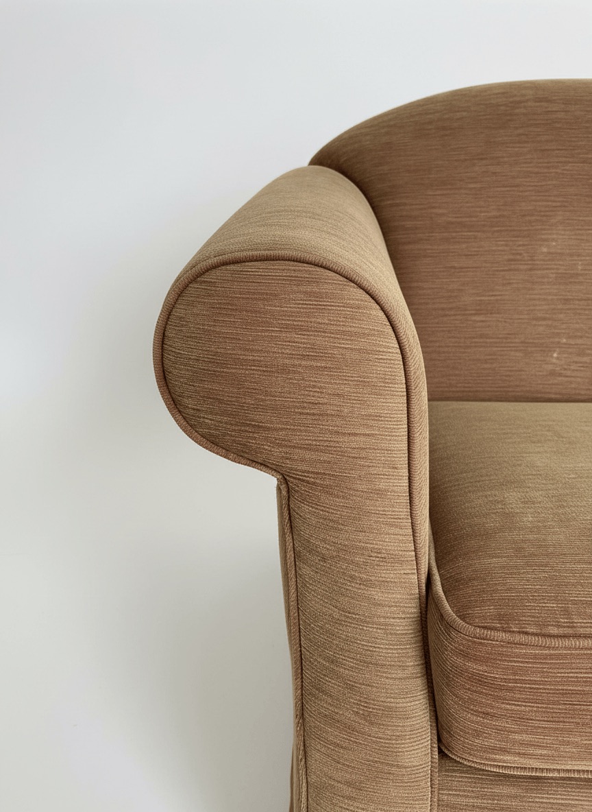 Sofá espaçoso e robusto de estilo tradicional, ideal para salas de estar familiares. Apresenta braços enrolados volumosos e acabamento com "saia" na base.