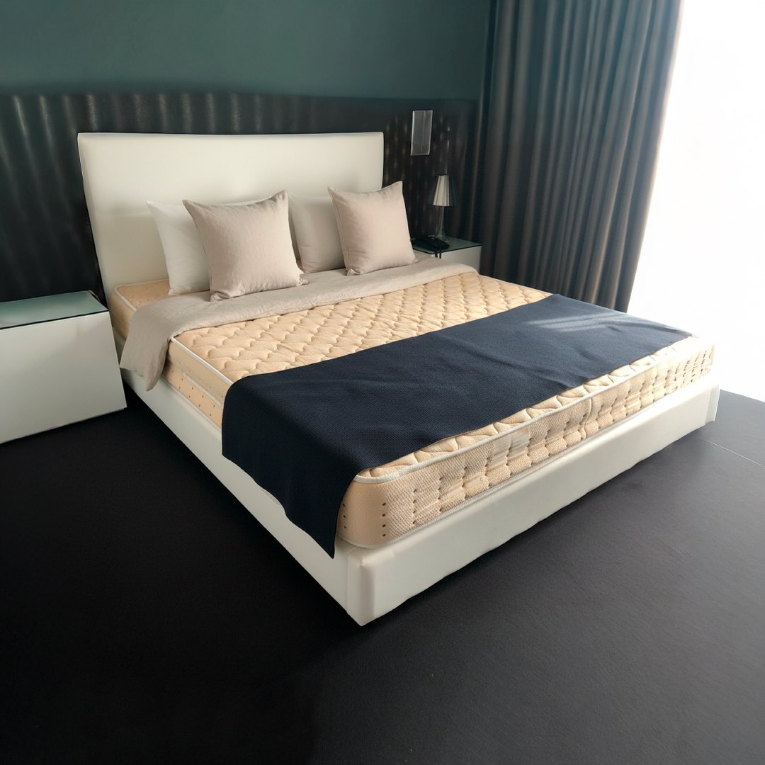 O estofo em material sintético branco está bem preservado, sendo de fácil limpeza e manutenção. Os pés em madeira conferem estabilidade total. Por ser um artigo de hotelaria, pode apresentar marcas mínimas de manuseamento ou transporte. Este sommier de dimensões generosas foi desenhado para oferecer o máximo suporte e durabilidade. Com um acabamento estofado acolchoado, adapta-se perfeitamente a quartos que procuram um ambiente sóbrio e equilibrado. A base é sólida, garantindo que o colchão assenta de forma plana para um descanso impecável.