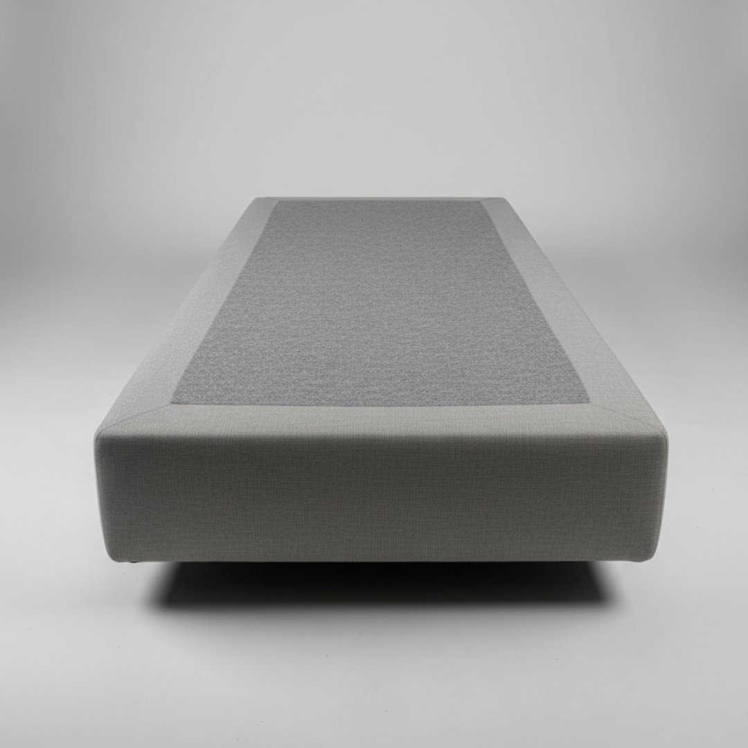 Este sommier estofado é ideal para um quarto de solteiro ou de hóspedes. . A superfície superior, onde o colchão é colocado, é coberta por um feltro cinzento robusto e resistente. A base está equipada com quatro rodas de plástico/borracha na parte inferior, permitindo fácil movimentação e ajuste no espaço. O produto encontra-se em bom estado geral, apresentando apenas sinais mínimos de uso normal, como alguma poeira ligeira no feltro superior, que é facilmente removível. Não há rasgos, manchas significativas ou danos estruturais visíveis.