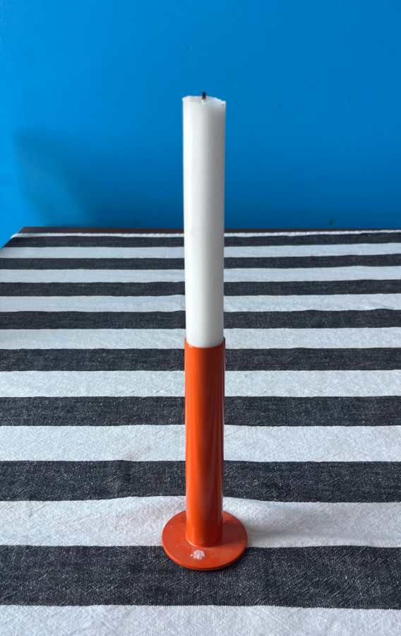 Castiçal de mesa em metal, cor laranja, com design minimalista e retro.