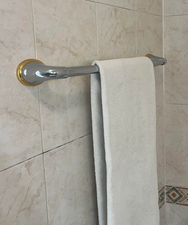 Toalheiro de parede em metal cromado, com detalhes dourados nas bases.