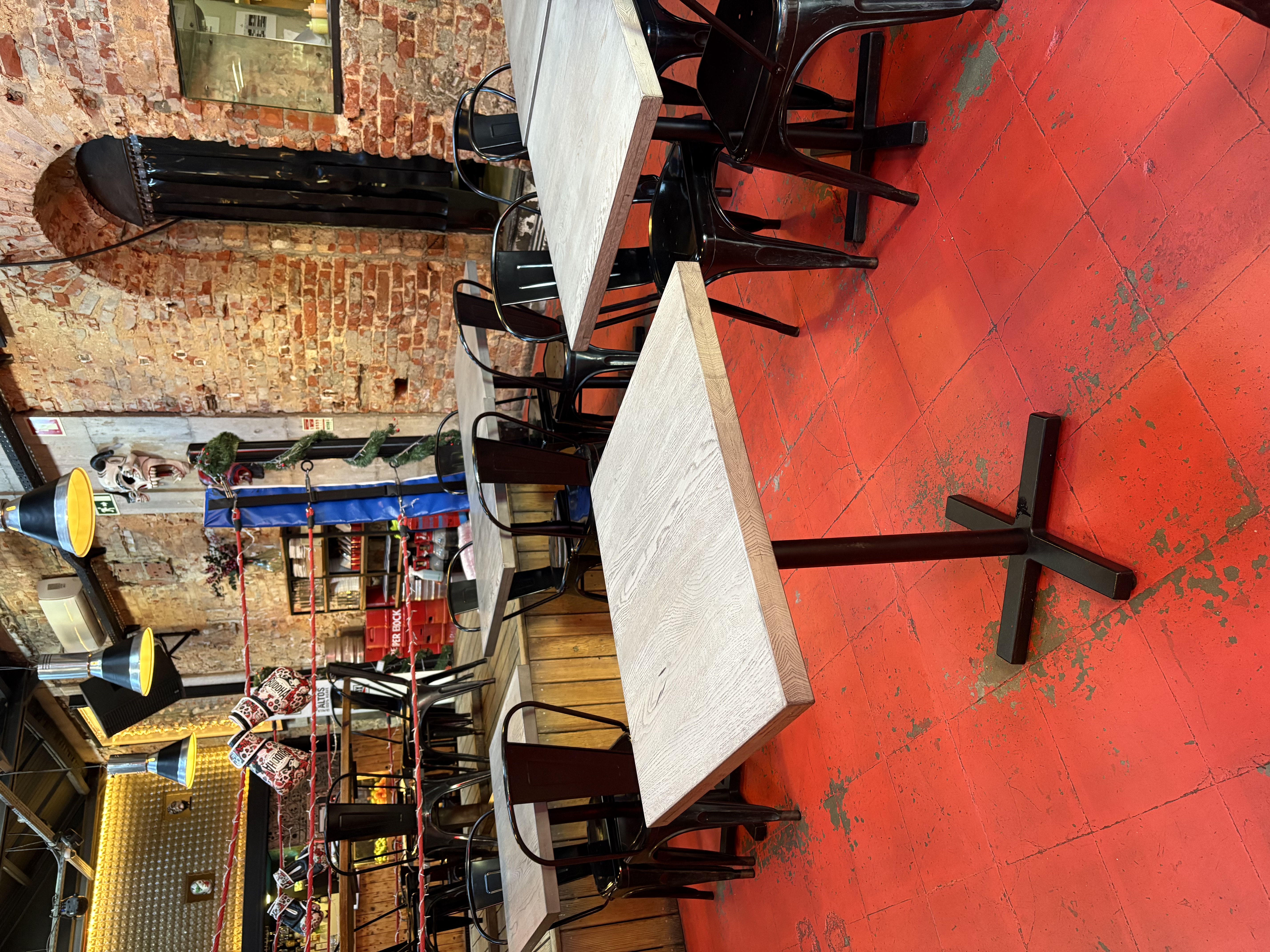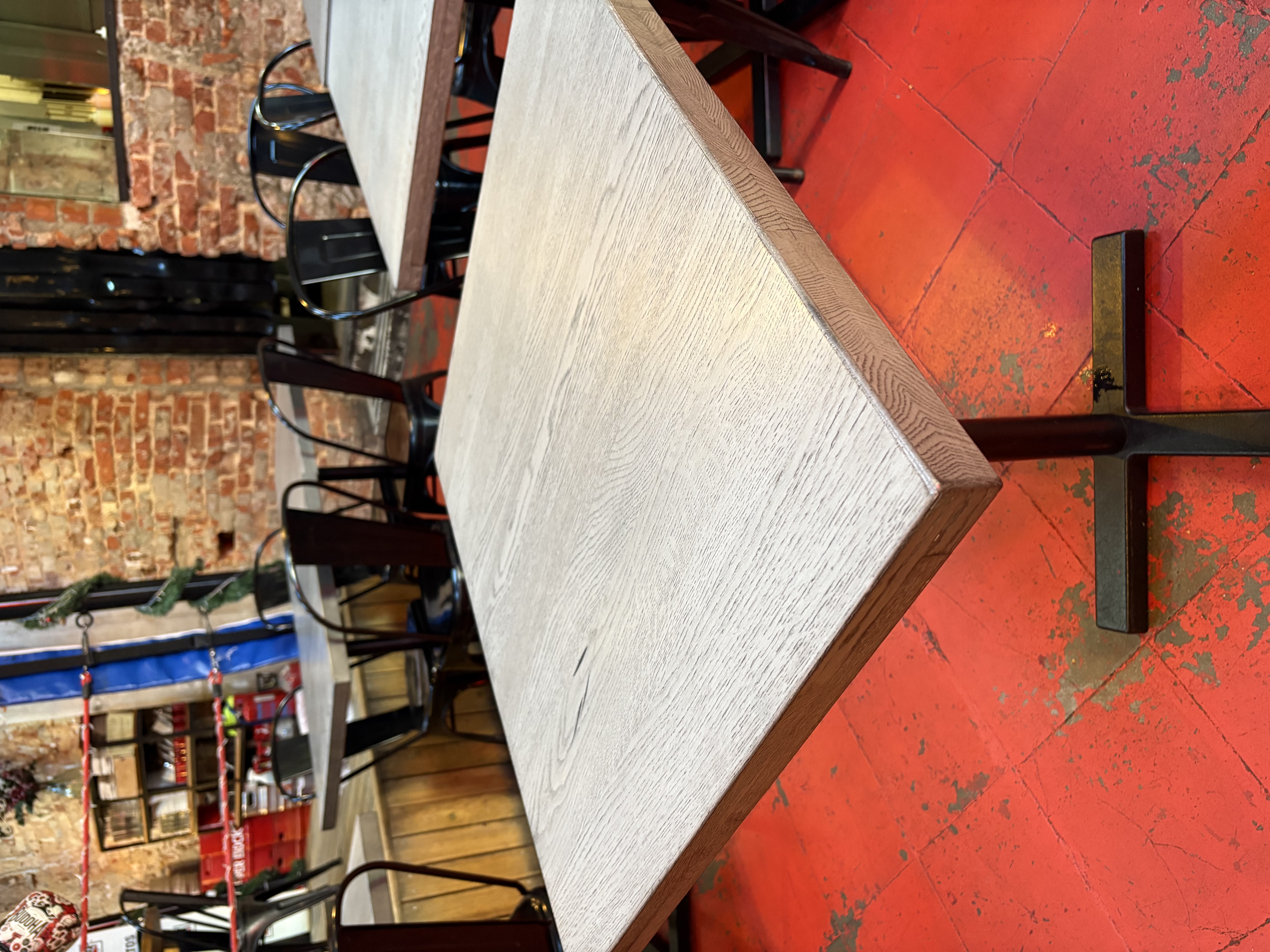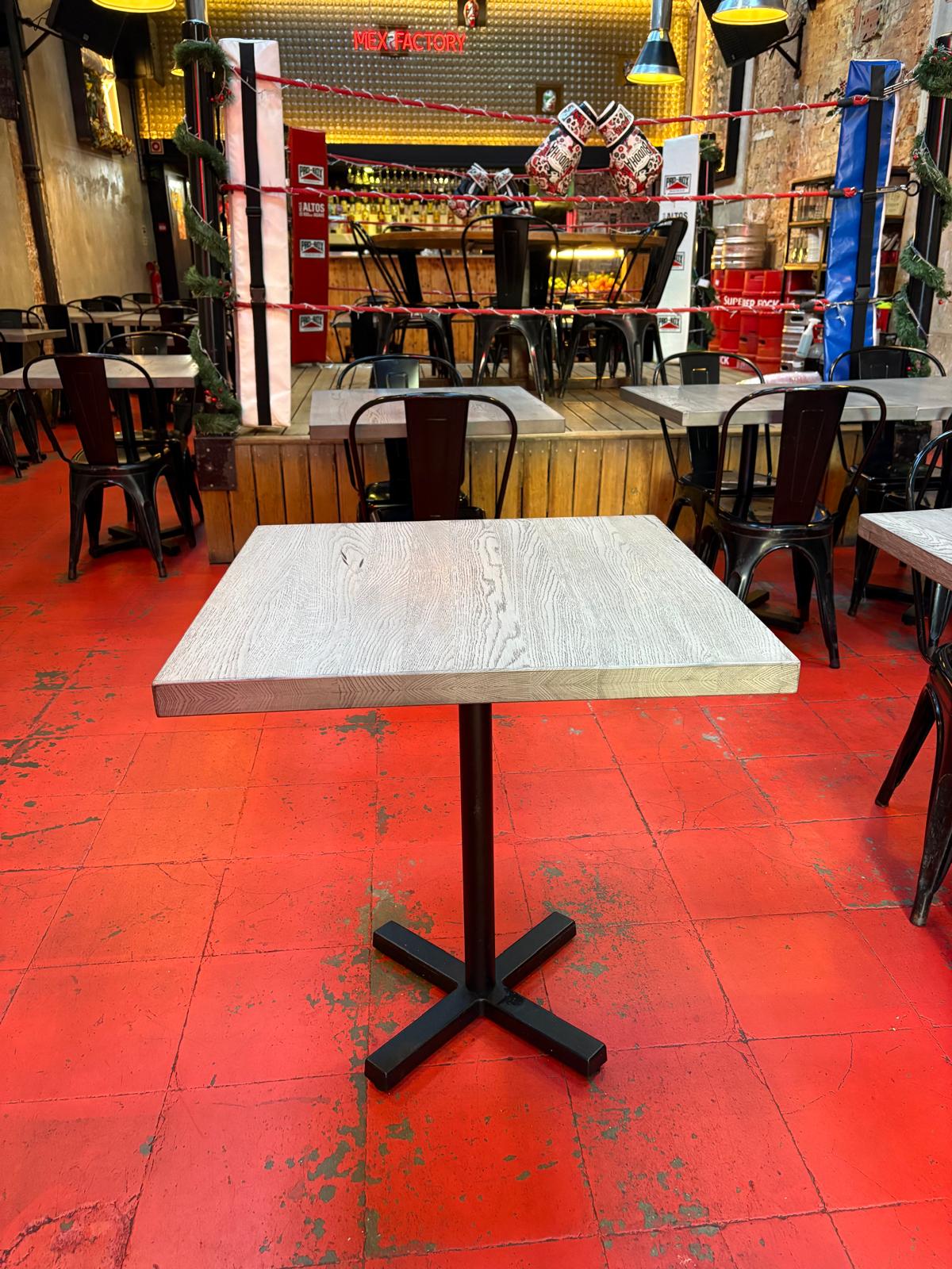 Conjunto de tampos de mesa quadrados, ideais para reutilização em projetos de restauração, hotelaria ou espaços comerciais. Fabricados em madeira com acabamento em tom cinza claro, apresentam um visual contemporâneo e neutro, fácil de integrar em diferentes conceitos de interior.